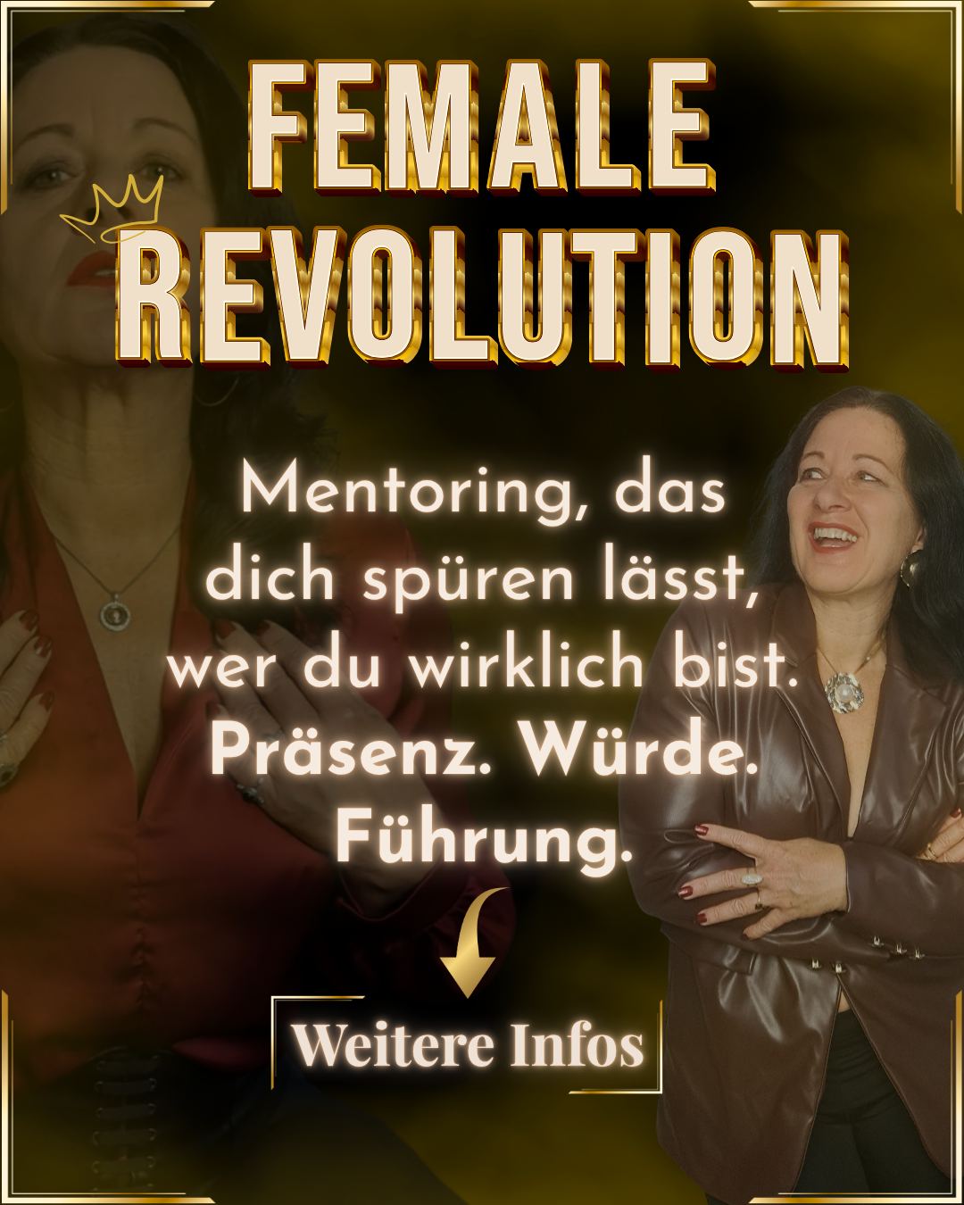 In meinem Mentoring FEMALE REVOLUTION begleite ich dich 12 Wochen lang durch eine radikale Rückverbindung zu deiner wahren Kraft, jenseits von Kampfmodus, Selbstverleugnung und Anpassung an ein System, das Frauen klein halten will.